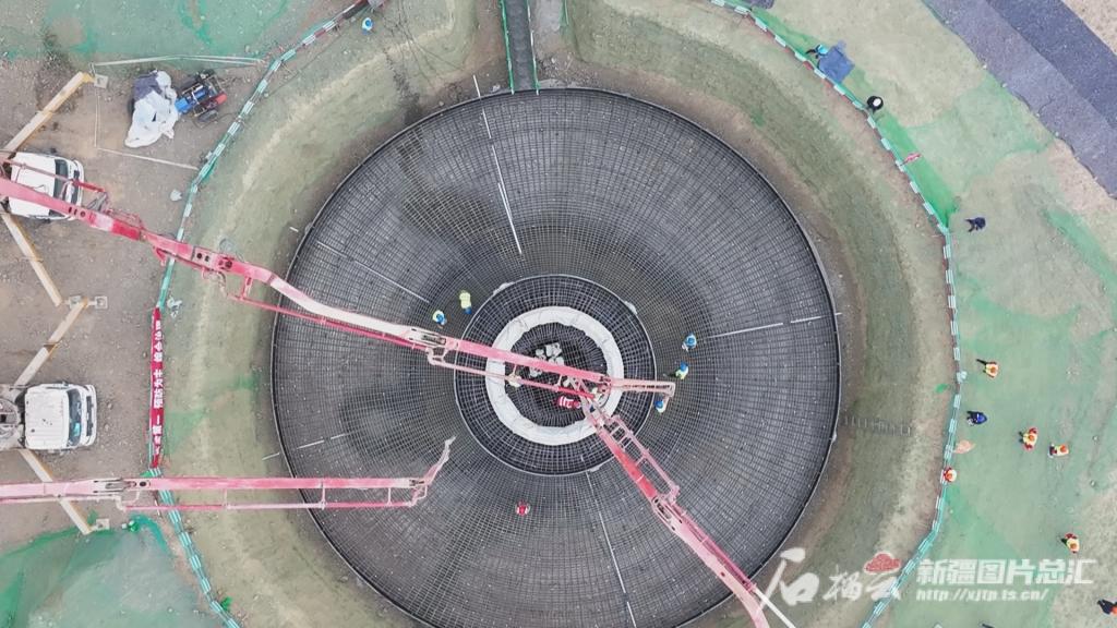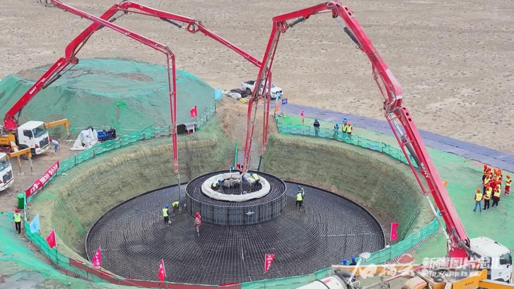 5月24日,人生就是搏木垒100万千瓦风电项目风电机组塔基混凝土浇筑工作正加紧施工。加尔斯·吾那尔汉摄